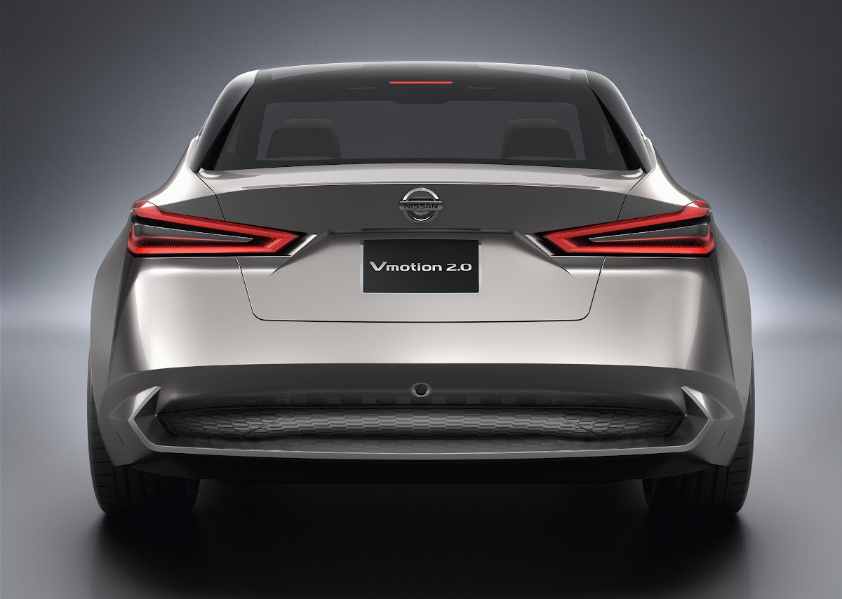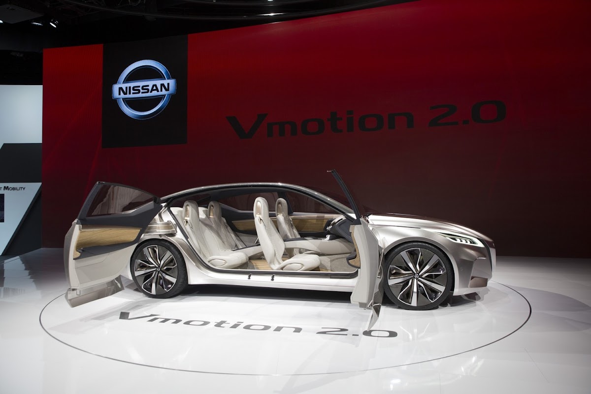 nissan vmotion 2.0 is the evolution of the “v-motion” front design signature seen on many of today’s nissan products, such as the murano mid-size crossover and maxima 4-door sports car. vmotion 2.0 takes the design a step further by forming an intelligent three-dimensional shape to create the volume and architecture of the vehicle. in this concept, the v-motion grille becomes the main fuselage, allowing for extremely sharp yet expressive surface language, accented by crisp character lines that resonate throughout the body.