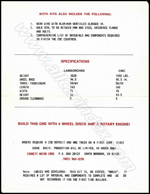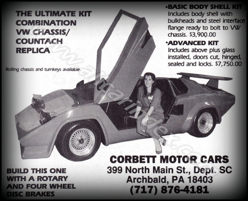 it is very easy to notice that corbetts countach replica actually was a sized down, modified reproduction. it was 3 inches (7.6 cm) shorter, 7 inches (18 cm) wider and 1.5 inch (4 cm) higher than the original. interesting point to mention is that it was kindly noted that the corbett countach kit is not for rookies: