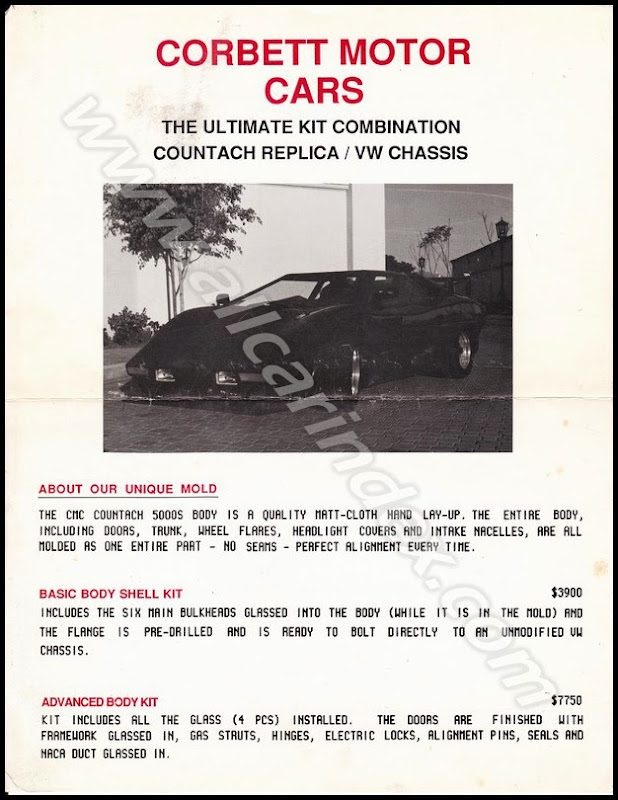 it is worth mentioning that the body of the corbett’s countach replica was molded as a single part. this ensured smoothness and excellent alignment for hand-laid matte-cloth fiberglass pieces. this kitcar was available in three forms. basic body shell kit included bodyshell with six main bulkheads and pre-drilled steel interface flange. it cost $3900. advanced body kit featured completely assembled and mounted doors, and all window glass installed. to be based on an unmodified vw type i irs chassis, this second option cost $7500. finally, a complete turnkey car was available for $26.500 (approx. $ 51.000 in current dollars).