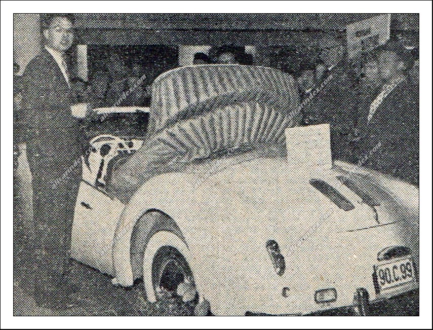 „... The body was made of polyester and fibreglass. The resin has been supplied by Solvay. I used my old VW that you can see on the picture too. Its motor was still good. The work has been done in 1955. In May 1956 the car has been exposed in Brussels in a stand of Solvay, where our king Baudoin came to see it. You may see him with me on the center picture. I made only one prototype and looked for an investor, but did not find one. I drove myself the car for 150.000 km, after what the chassis was at the end. Recently, I made a prototype of electric car, but here again I did not find an investor...“