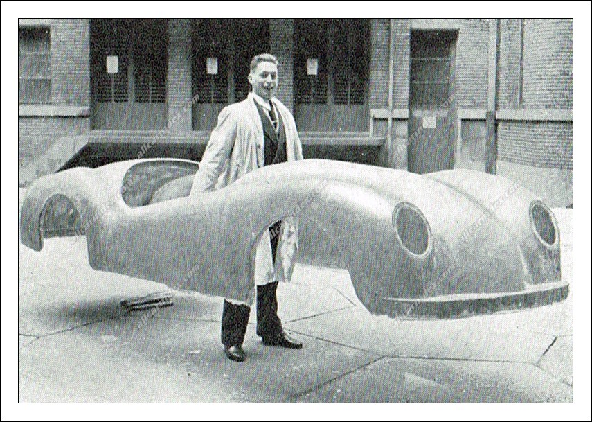 Several car studies were made, i.e. a 1946 Chrysler from the USA ( fibre- glass body and chassis ), around 1950: - a British experiment with plastic on an Austin A 40.