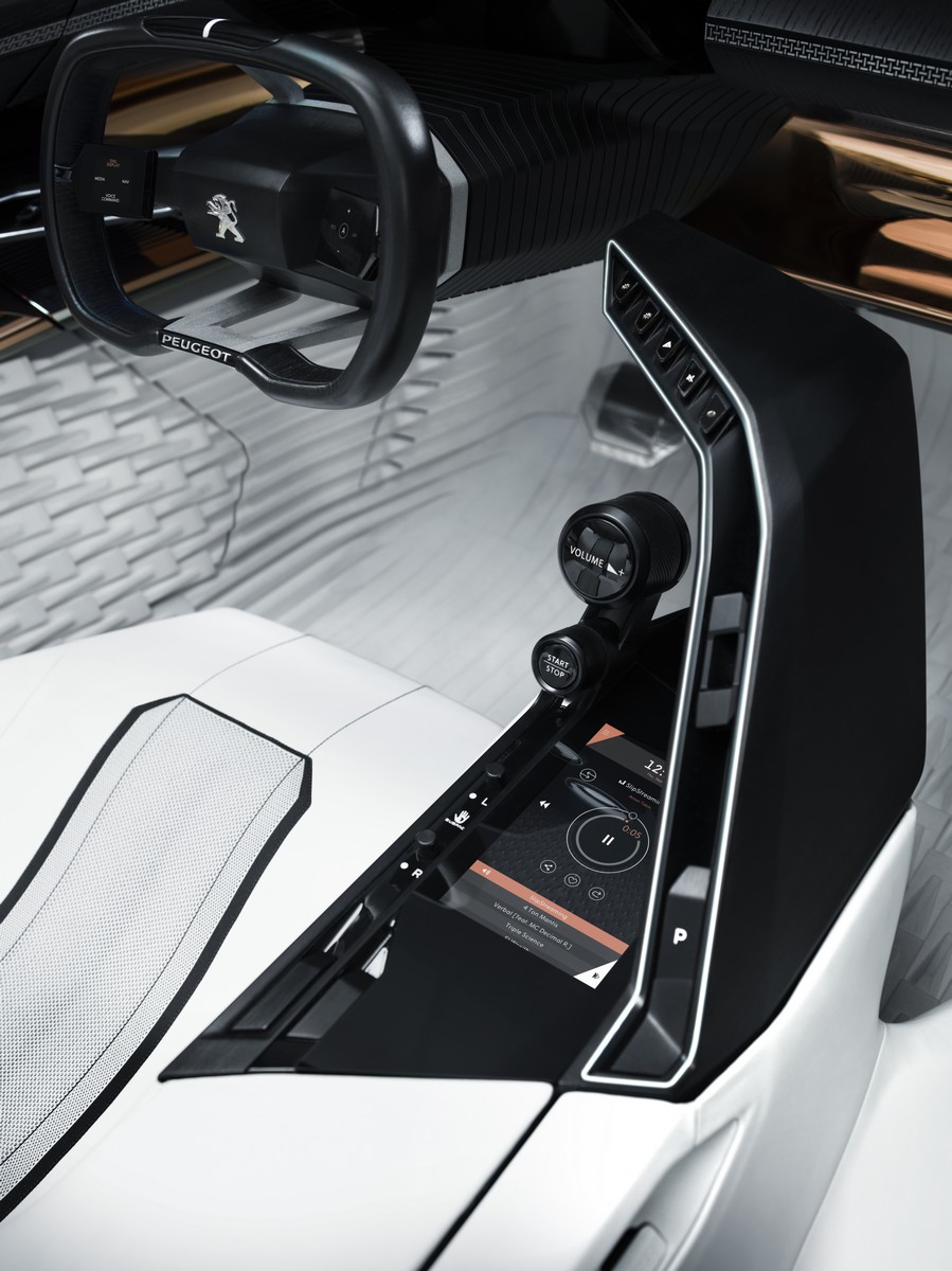 the right-hand arch also houses the controls to activate the electric drive system. the 7.7-inch amoled touchscreen built into the centre console can be used to control all peugeot fractal functions. passengers in the rear also have a panel allowing them to adjust their immediate surroundings.