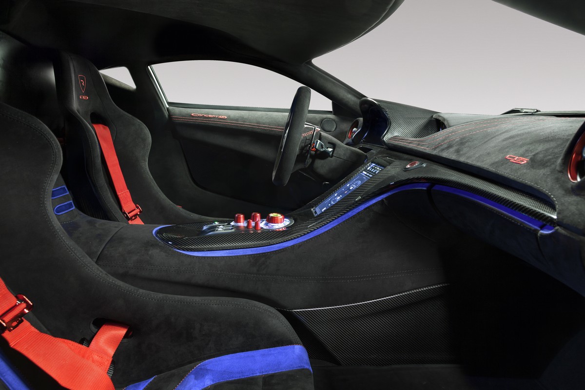 The experience gathered during the Pikes Peak program was implemented in the Concept_One and adapted to suit the comfort and performance of a hypercar on road tires. Knowing how much the RAWTV system can provide on racing tires, Rimac Automobili decided to awake the Evil Twin, the Concept_S. Featuring a big front splitter, air deflectors, side skirts, diffuser together with a large rear spoiler, the Concept_S comes with greater aerodynamic downforce. Different carbon-fibre materials and lay-ups are used to reduce the weight of bodywork by 7 percent. The interior is stripped of sound insulation with minimized use of materials and a toned-down design so that the driving excitement can take center stage. Racing seats with four-point racing harness ensure a fixed and focused driving position. Alcantara trim with red stitching and blue lines on the seats converge with the exterior details. The raw racing character is underlined by long stretched curved features of naked carbon fibre. The CNC machined buttons and knobs on the center console unit are anodized in red, enhancing the racing feeling and accompanying the focused infotainment system that projects only the most important information on the central display and the digital instrument cluster.