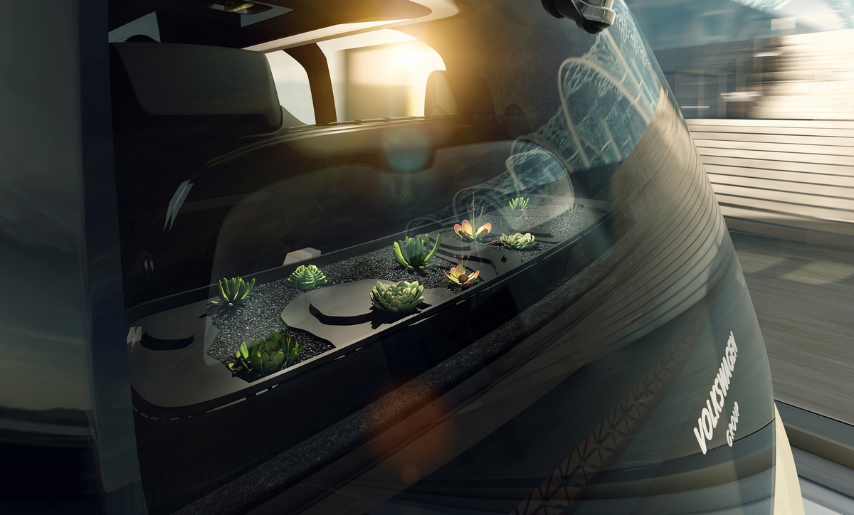 the 2+2 person design of the interior makes optimum use of the floor area of the vehicle. the two rear seats act as a very comfortable couch. fresh air to breathe and a good air-conditioning system are ensured in a particularly ingenious design. sedric really does have green technology on board: air-purifying plants positioned in front of the rear windscreen enhance the effect of generously dimensioned bamboo charcoal air filters.