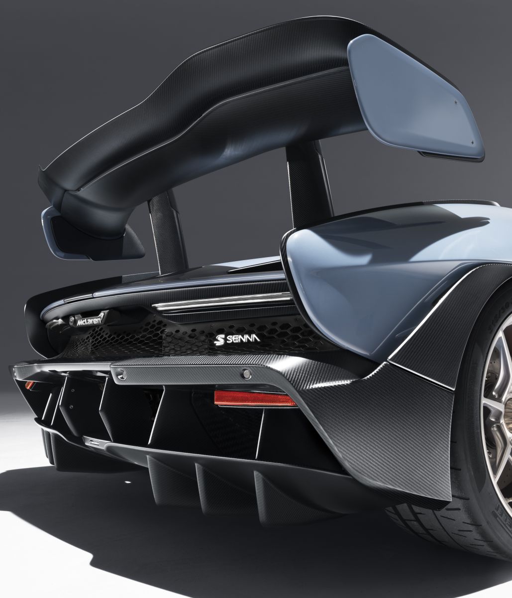 The exhaust pipes exit through the lowest rear deck (measured at the trailing edge) of any McLaren road car, a full 18cm lower than the McLaren Super Series. In contrast to the ultra-low rear deck, the hydraulically-operated, double-element carbon fibre rear wing – a major contributor to the downforce generated – is noticeably high and constantly adjusts to optimise downforce and maintain ideal aerodynamic balance. The wing weighs just 4.87kg, yet can support more than 100 times its own weight in downforce.