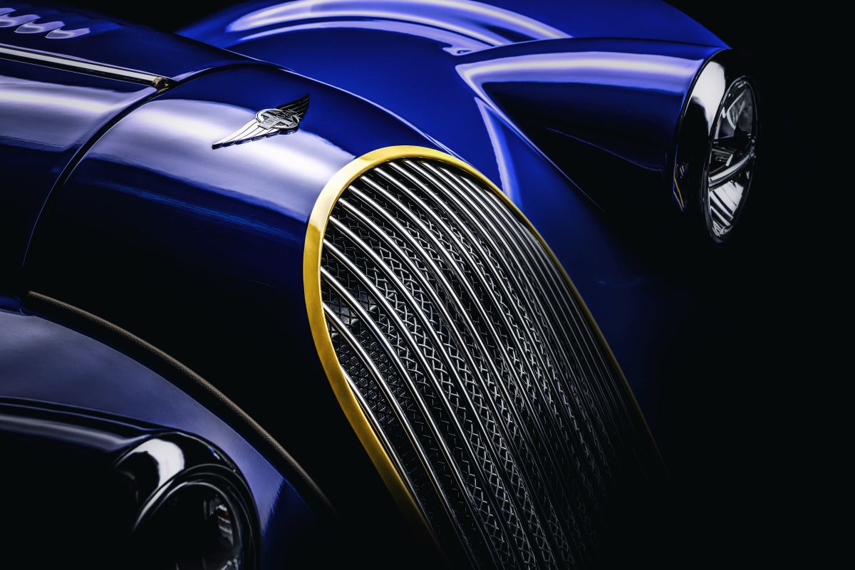 the teaser images released by morgan show a blue lacquered paint finish, reminiscent of the british coachbuilder’s first plus 8 production model (known as mmc11), with hints of hand-painted yellow accents around the car’s iconic front grill, along the bonnet and on the rear towing eyes.