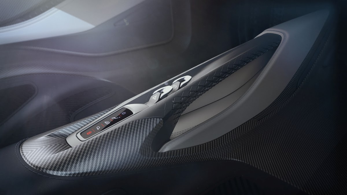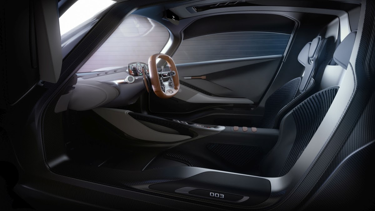The cockpit itself showcases a bold new design and material philosophy aimed at achieving a reduction in visual clutter and the creation of a uniquely stimulating, dynamic and focussed driving environment. Called ‘Apex Ergonomics‘, it relies on the perfect alignment between the centreline of the driver’s back, steering wheel and pedals and the careful positioning of other elements throughout the cabin to support this driver focussed experience.
