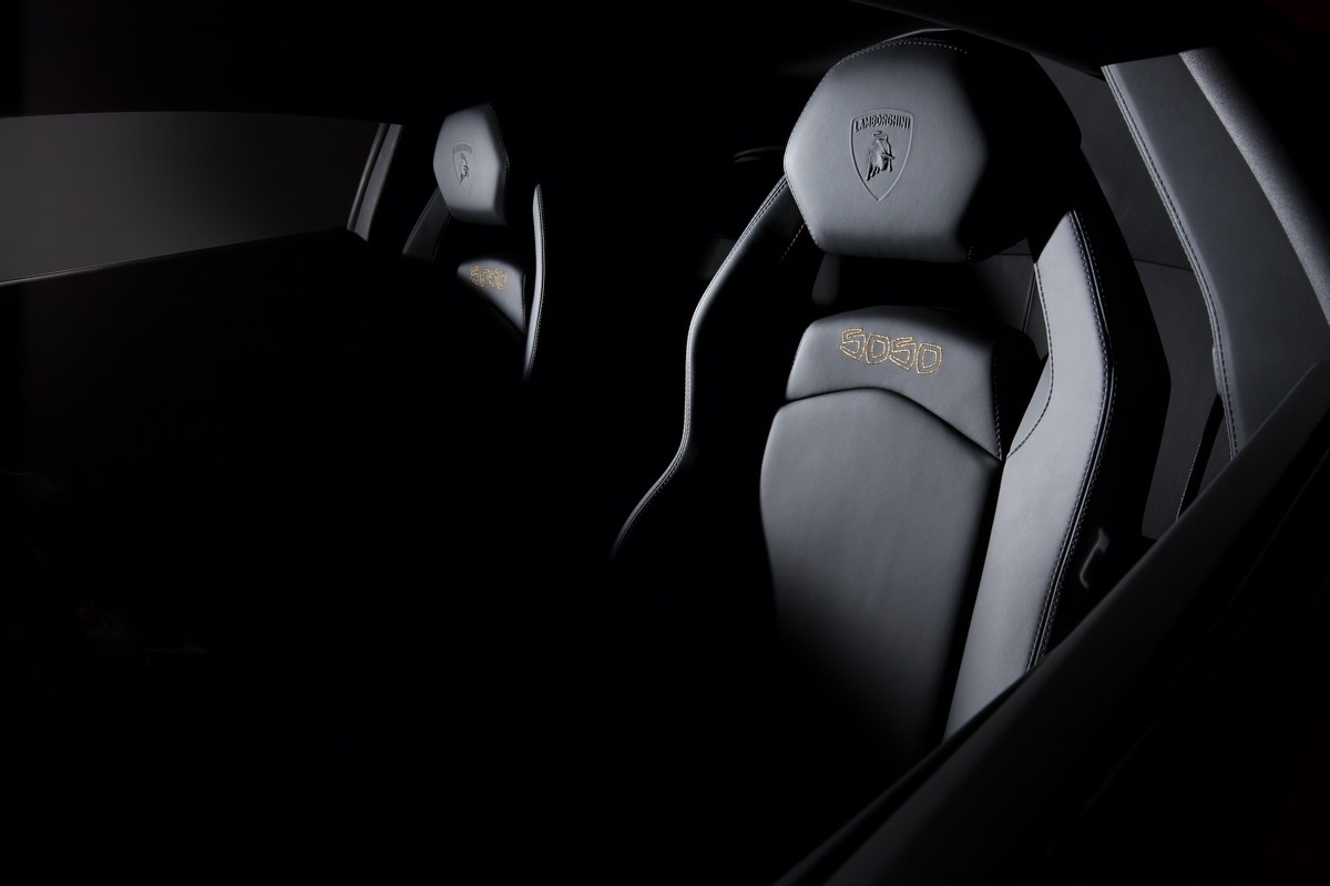 two internal color options are offered, in full nero ade or terra emilia leather with tone-on-tone stitching and carbon fiber package as standard. the miura 50th logo is stitched into the upper part of the seats in gold or silver to reflect the car’s livery, and the ‘lamborghini’ lettering embroidered on the leather dashboard.