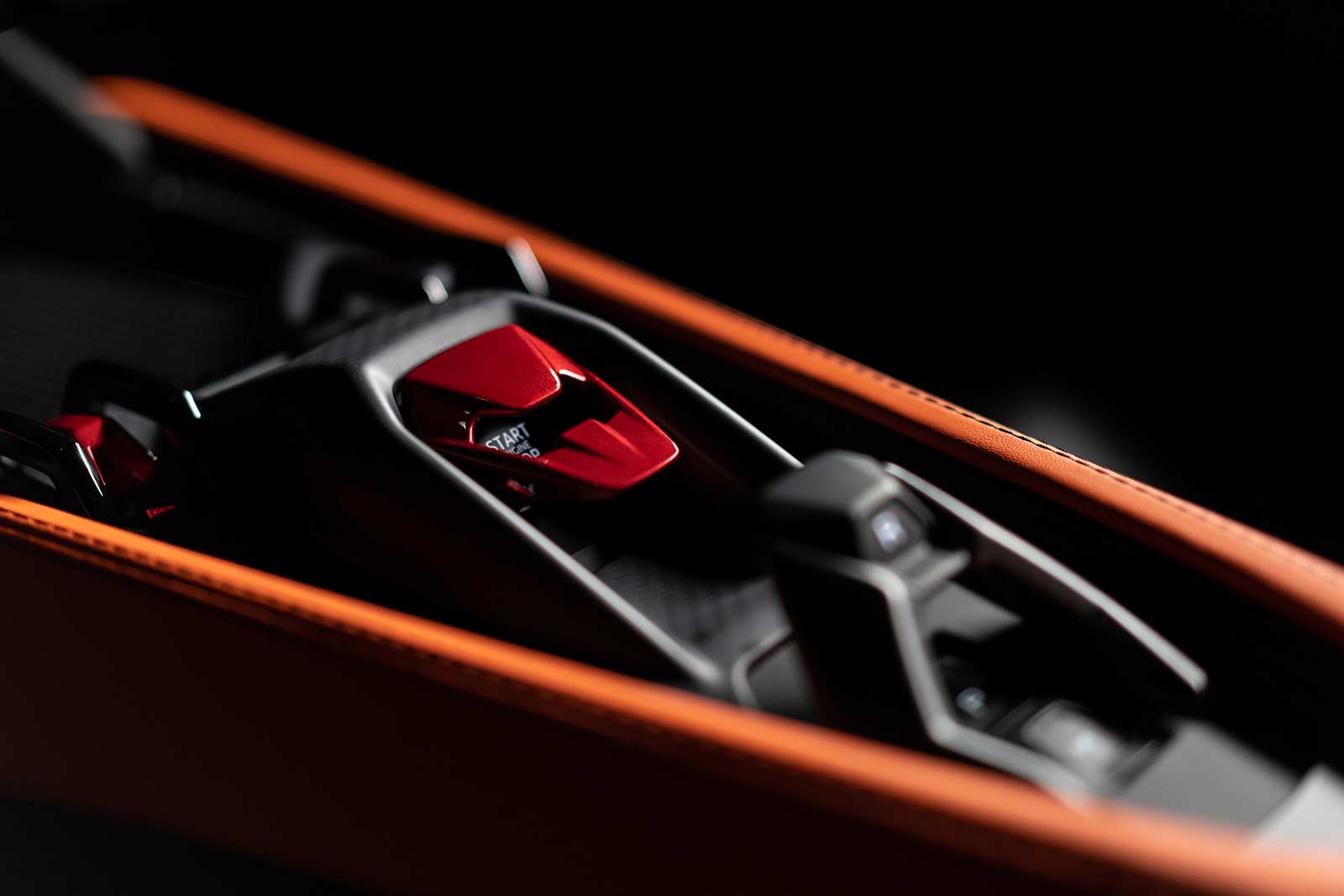 The steering wheel was inspired by the racing world and the experience of the Essenza SCV12. The four rotors located on the spokes are used for selecting both the driving modes and the car’s lifting system and rear wing tilt. The intuitive design of the cockpit and controls deliver a distinctive Lamborghini feeling: buttons are used to activate the turn signals and the launch control among other functions, while allowing the driver to maintain an optimal grip on the steering wheel at all times.