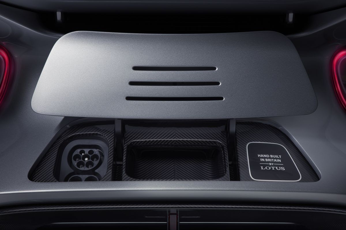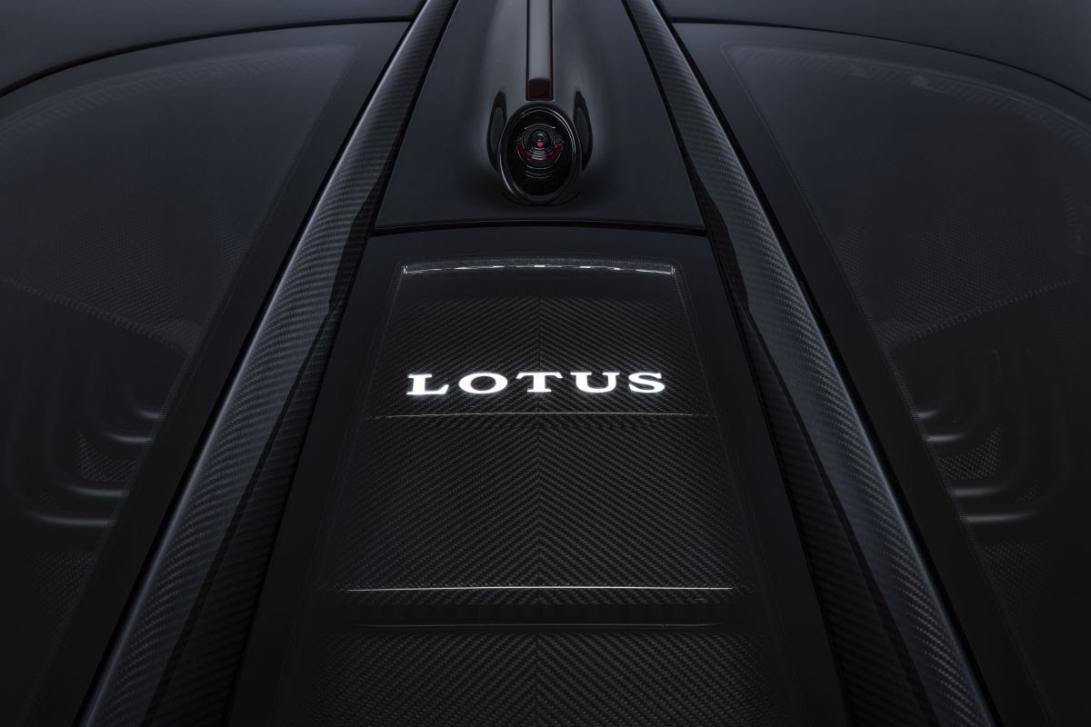 The directional indicators are incorporated into the corners of the ribbon, while the reversing light is provided by the illuminated ‘T’ of the ‘LOTUS’ wordmark above the integrated charging flap.