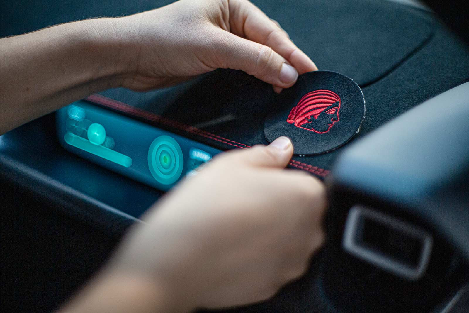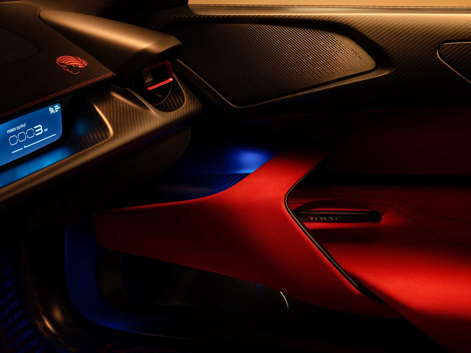 Inside the Nevera, customization options are extensive. Mate chose an asymmetric trim, predominantly black on one side and red on the other, along with personal motifs like embroidered images of Solinjanka. The interior can be tailored with various materials and colors, from Napa leather to Alcantara, with metal surfaces anodized in a wide array of colors.