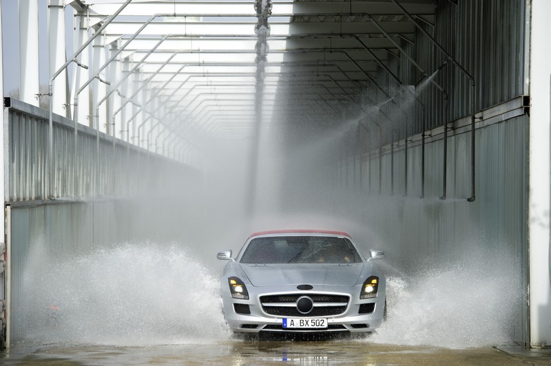 the rain test at the mercedes technology center (mtc) in sindelfingen is particularly demanding, and every new vehicle bearing the mercedes star is required to pass it - whether it has a fixed roof, a soft top or a vario-roof. extreme quantities of water are used to ensure that the result of the development work is watertight – which is a particular challenge in the case of roadsters or cabriolets. 16 tests must be successfully absolved before approval is granted.