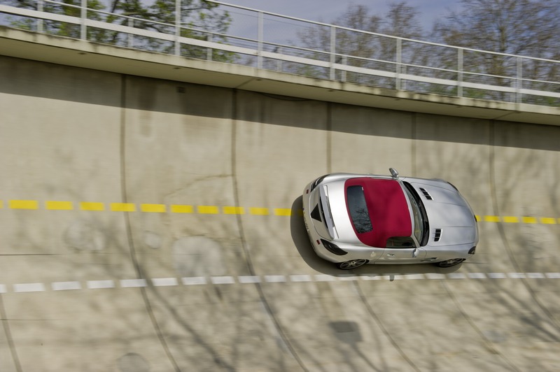 the three-layered fabric soft top of the sls amg roadster, which is deposited behind the seats in a z-formation to save space, is also an aspect relevant to handling dynamics. this weight-optimised, combined magnesium/steel/ aluminium construction ensures a low centre of gravity and is designed for speeds up to the maximum of 317 km/h (electronically limited). whether open or closed, even at top speed there must be no intrusive flapping, booming, hissing, clattering, whistling or howling. likewise the push-on glass draught-stop and the panelling in the interior, on the soft top and along the beltline must be vibration-free. nothing must be allowed to compromise the open-air enjoyment. the basis for verified, customer-compatible results in extreme conditions is provided by precisely defined test drives on the high-speed tracks in papenburg, nardo (italy) and idiada (spain).