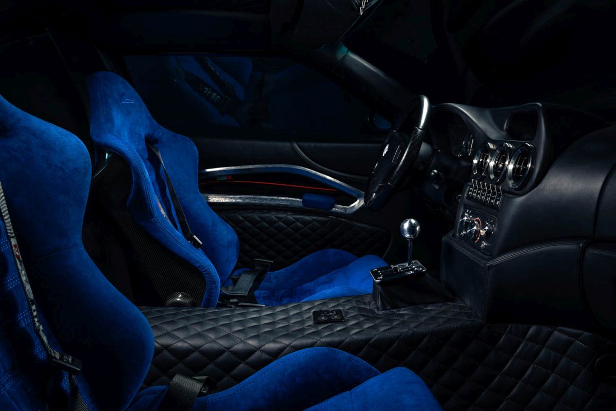 The Breadvan Hommage features a handmade interior. The iconic outline of the exterior design has been embroidered into the blue Alcantara carbon fibre backed seats. The monogram can also be found on the dials, all 7 boasting pure silver inlays. The clock says: 'che importa'. Italian for 'who cares!' All switchgear is made out of milled aluminium, linking to the gated shifter, which is set on a raised block. The driver is surrounded by quilted black leather: it can be found on the centre console, the lower door cards and the headliner. The door panels feature an unpainted, hand beaten aluminium element, which links to the custom body, made in the exact same way. A small embroidered Italian flag in the corner of the aluminium insert is highlighting the roots of the vehicle. The door is opened through pulling a lightweight red cord, whilst a blue Alcantara insert functions as grab handle to close it.