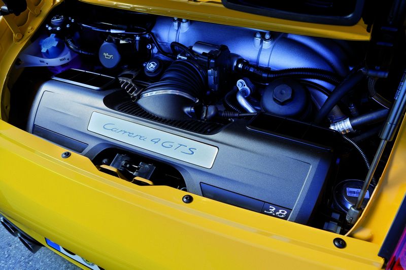 the 911 carrera 4 gts power unit has its origins in the 3.8-litre, six-cylinder carrera s engine. a wholesale revamping of the intake duct added 23 hp (17 kw), taking the power output to 408 hp (300 kw) at 7,300 rpm. the special aspiration system not only improves peak power output but flexibility and power development as well thanks to a more generous torque curve in the lower and middle engine speed range. 320 newton metres kick in from as low as 1,500 rpm; the six-cylinder engine delivers its rated torque of 420 nm in the broad engine speed range from 4,200 rpm and 5,600 rpm. the sports exhaust system fitted as standard ensures a distinctly sporty sound. it invests the new carrera 4 gts with an unmistakable acoustic signature and the rear view of its tail pipe with its unique black surface design lends it a unique character.