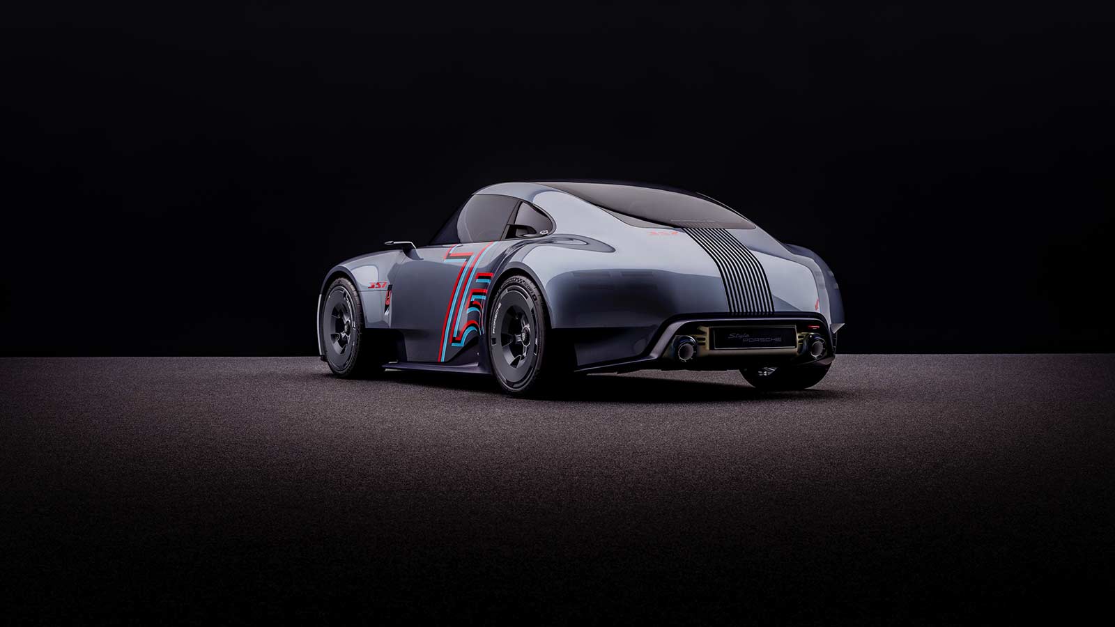 The “75” anniversary logo adorns the doors and the front of the design study like a start number. And that is far from the only detail from the world of racing: there’s nothing behind the lower area of the front wheels, which allows better ventilation of the wheel arches. The wrap-around, jointless front bonnet is fastened with quick-release mechanisms. Threaded rods stabilise the large front spoiler. On the side sills, the Porsche designers employed natural fibre-reinforced plastic (NFRP) – as in the Porsche Mission R, the concept study for an all-electric GT racing car presented in 2021. The basis for the sustainable materials is provided by flax fibres from agriculture. Instead of traditional exterior mirrors, the design study is equipped with cameras on the edge of the roof. The visible tailpipe trim in the rear is made of a blueish-looking titanium, while the inside of the tailpipe is made of ceramic.