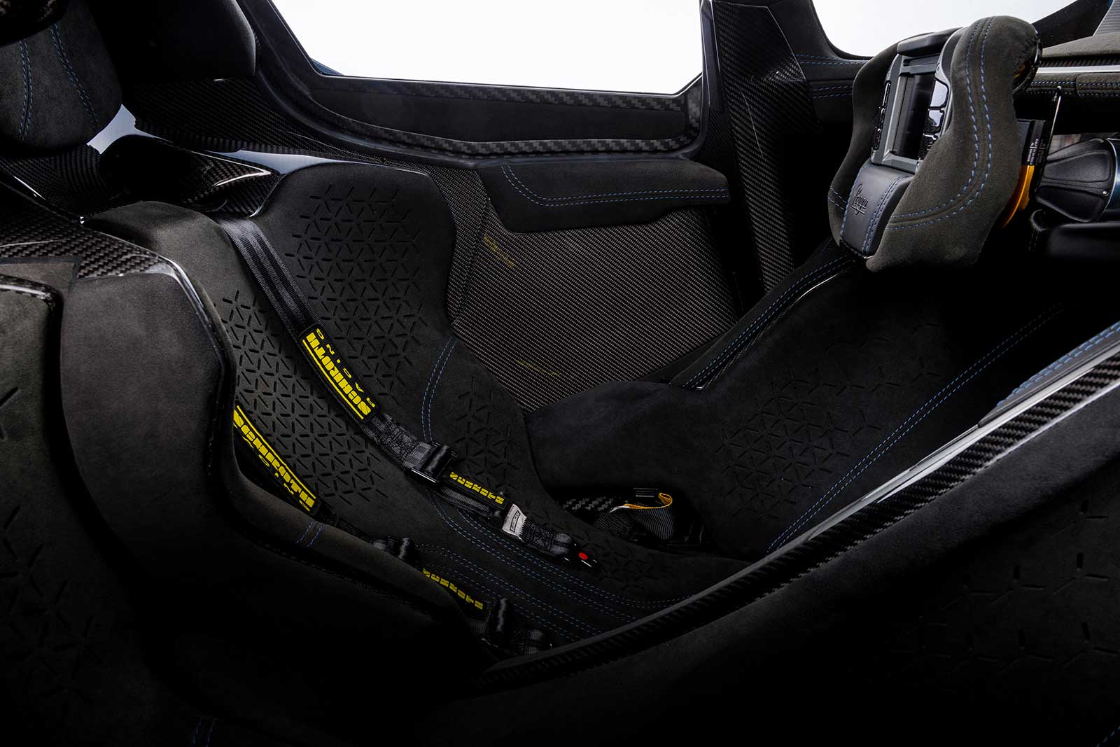 While everything in the cockpit is designed to contribute to the car’s low weight target and functionality, the aesthetics and attention to detail have not been overlooked – the beautifully machined thumbwheels and air vents, the finishing of the interior carbon fibre and the exquisite hand stitching of the Alcantara are perfect examples.