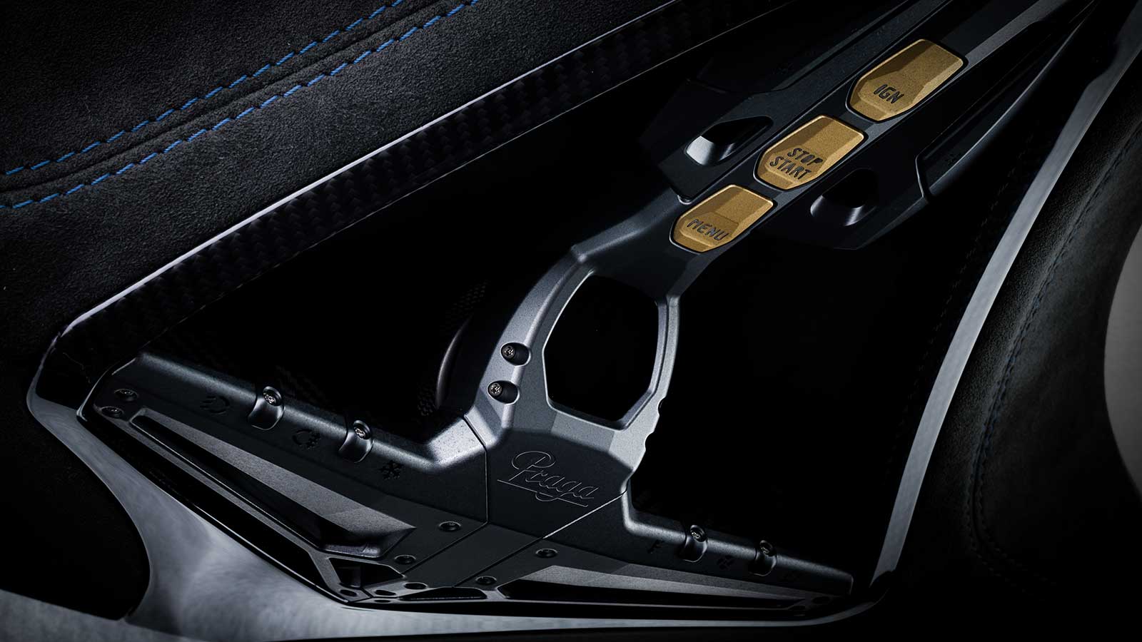 The removable steering wheel in itself is a work of art. It incorporates a large digital display, showing speed, gear selected, oil and coolant temperatures, driving mode and warning lights. To either side is a switchgear for indicators, horn and further functions, plus rotary thumbwheel selectors. The rim is beautifully trimmed in Alcantara and the central pad is covered in leather with an embossed Praga logo. The grip and paddles’ size and positioning have been designed perfectly to offer steering and shift control comfortably for small and large-handed drivers alike.