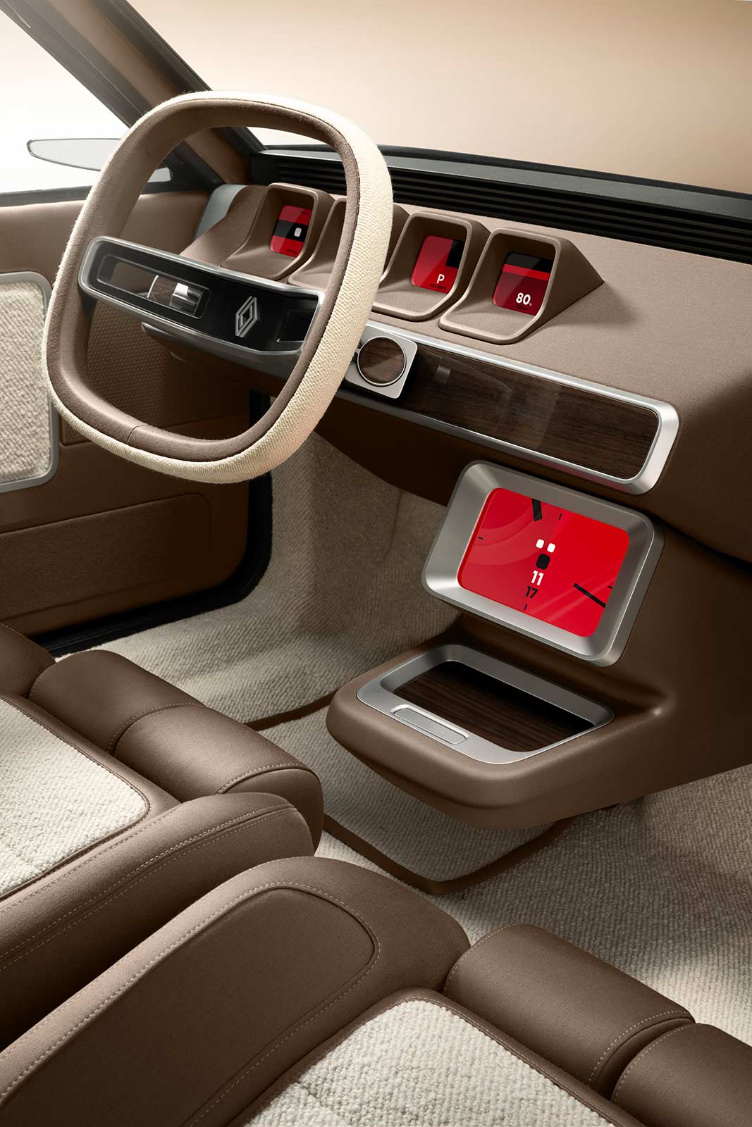 Ora Ïto's design also extends to the interior, which has undergone a significant transformation while staying true to the Renault 17’s spirit. The original’s iconic “petal” seats have been reimagined with modern upholstery materials, including fine Merino wool and lightweight wool bouclé, drawing inspiration from the world of interior design. The cabin retains its signature driving position and comfort, but now features a new dashboard and center console with four small geometric screens behind the steering wheel—cleverly inspired by the classic car’s dials.