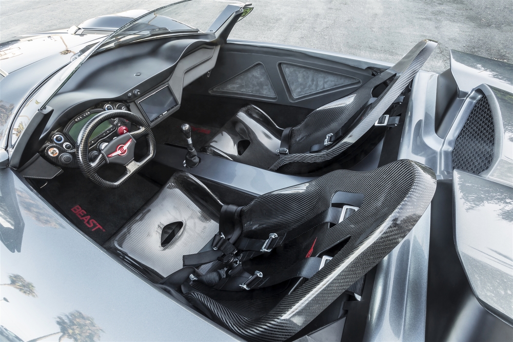 In an age where many supercars rely on electronic aids, the Beast gives control back to the driver. Using a 2.4-liter 4-cylinder engine featuring a crank-driven Rotrex supercharger and turbocharger, and a manual gearbox (optional sequential automatic), Beast sends 500 horsepower to the rear wheels.