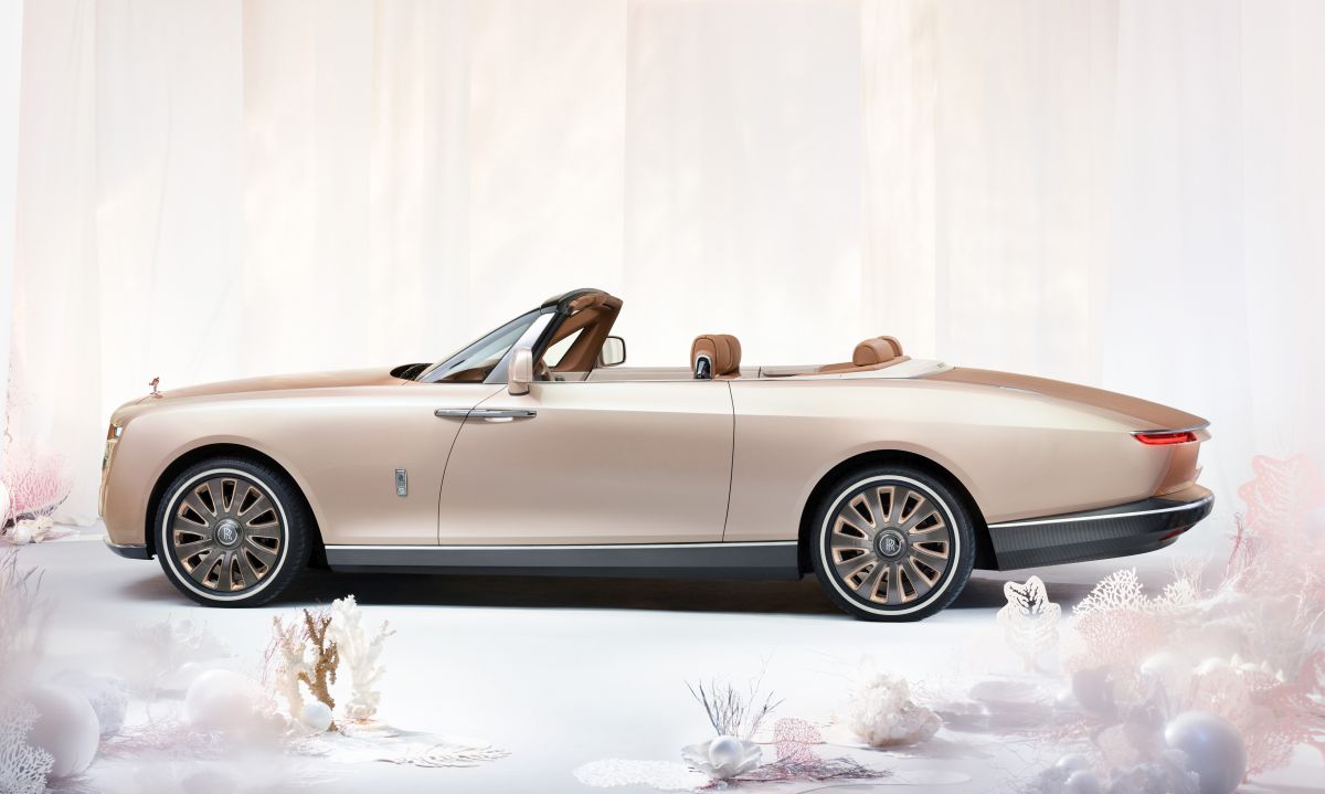 The foundation of the colour is a shimmering blend of oyster and soft rose, with large white and bronze mica flakes adding a unique pearlescent quality that changes subtly under different light conditions. The contrasting cognac-coloured bonnet, created specifically for this Boat Tail, contains fine bronze and gold coloured aluminium mica flakes complete with a layer of crystal and iced matt clear coat, adding significant warmth and depth to the car's appearance. The technical fibre lower sills of Boat Tail incorporate a rose gold woven thread.