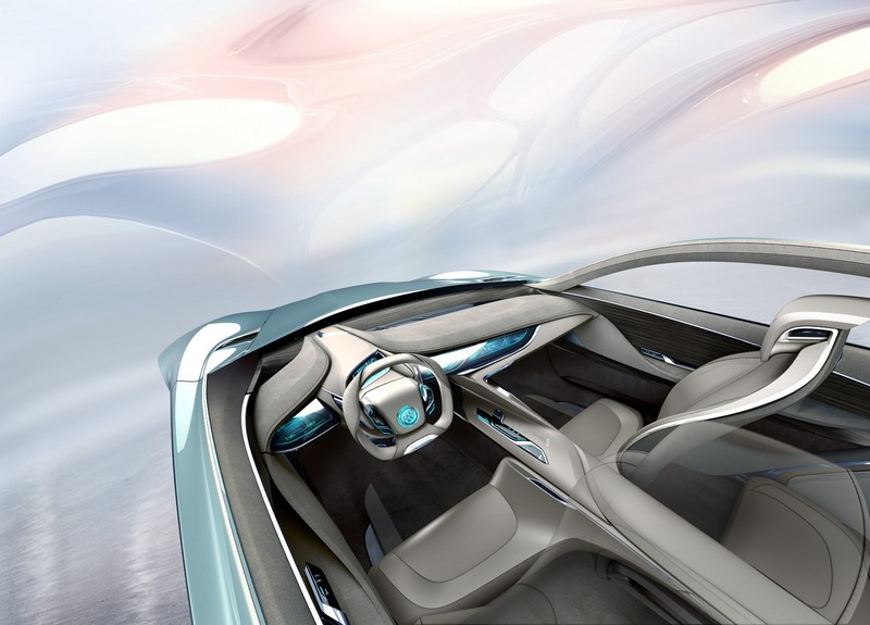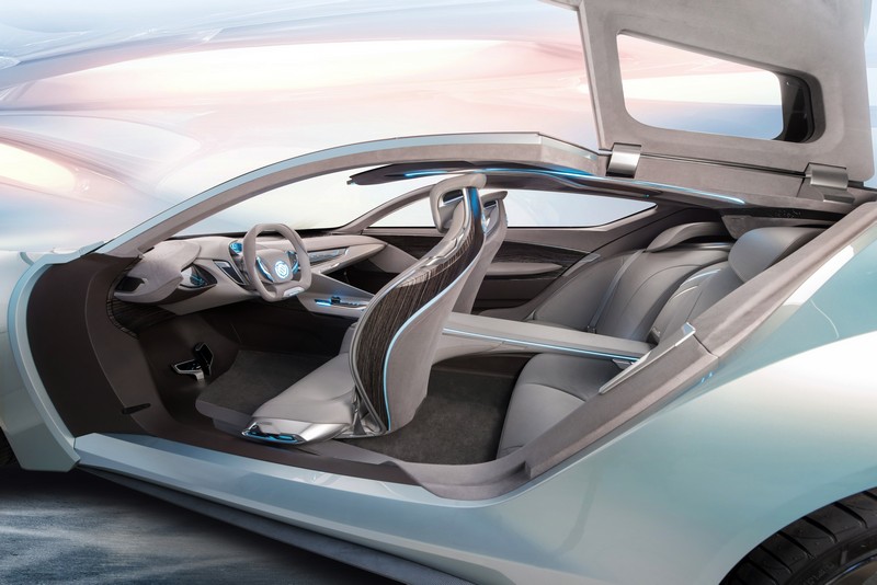 the concept’s silhouette with buick's recognizable "sweep spear” has a three-dimensional effect that resembles waves in the ocean coming to a standstill for a split second. buick's unique gull-wing doors exude a dynamic yet elegant ambience. the new riviera has an ice celadon finish inspired by jade.