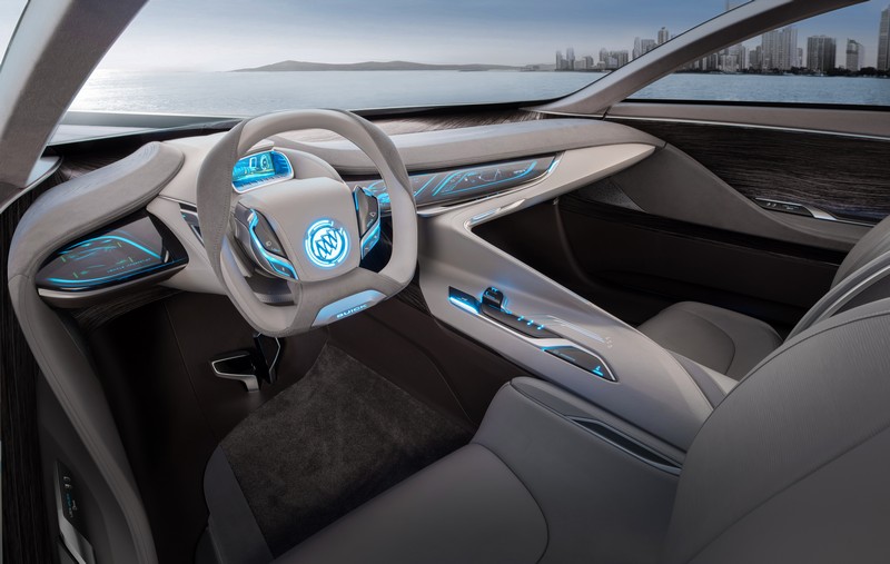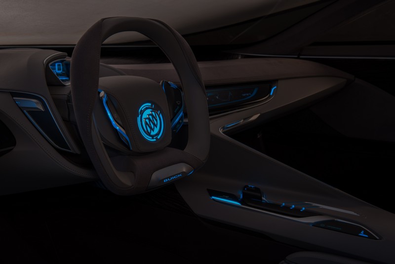 up front, the concept vehicle’s updated waterfall grille and wing-shaped daytime running lights will both become key elements of buick's future design dna.