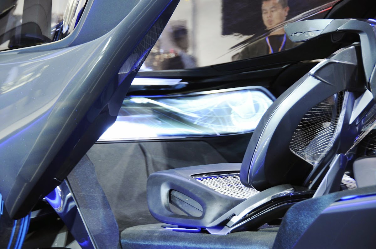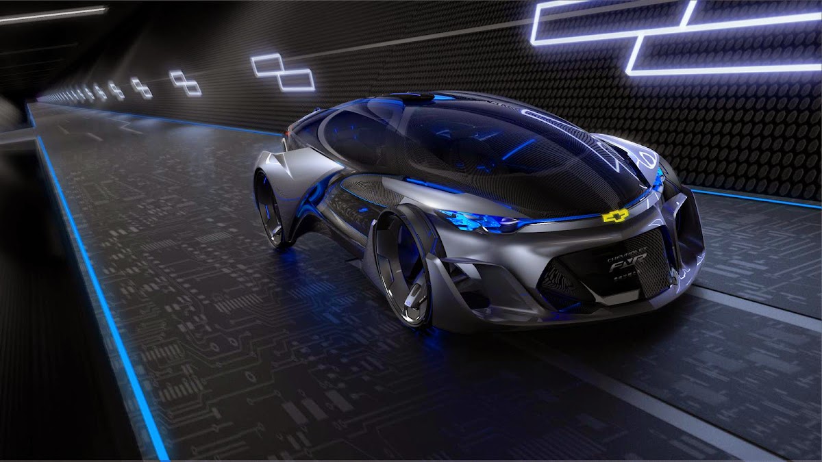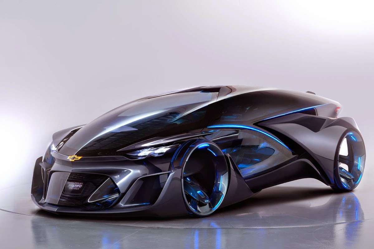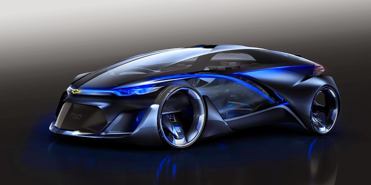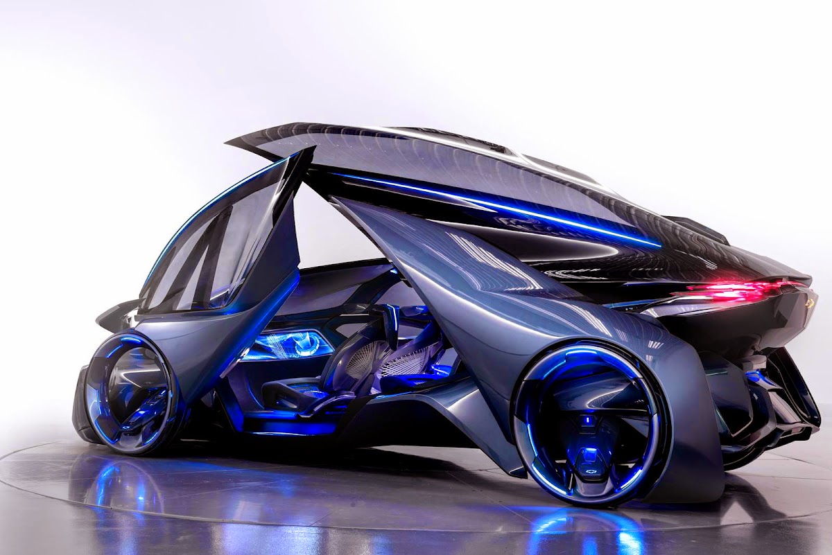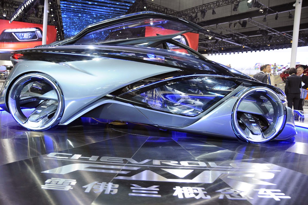 the chevrolet-fnr boasts a futuristic capsule design. it has crystal laser headlights and taillights, dragonfly dual swing doors, magnetic hubless wheel electric motors and a wireless auto-charge system.