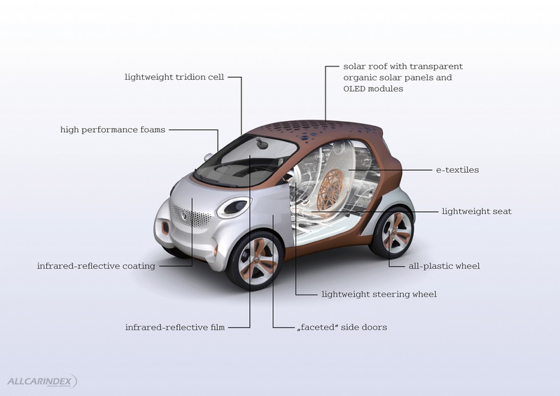 because it has always set itself apart from other vehicle concepts, the smart was predestined for this joint project. as a result, the smart forvision is the perfect vehicle for showcasing new technologies. the researchers and developers have succeeded in combining no less than five automotive world premieres in the new concept vehicle. transparent organic solar cells, transparent organic light-emitting diodes, all-plastic wheels, new lightweight body components and infrared-reflective films and coatings all help to reduce the vehicle's energy consumption and thus increase its range and practicality.