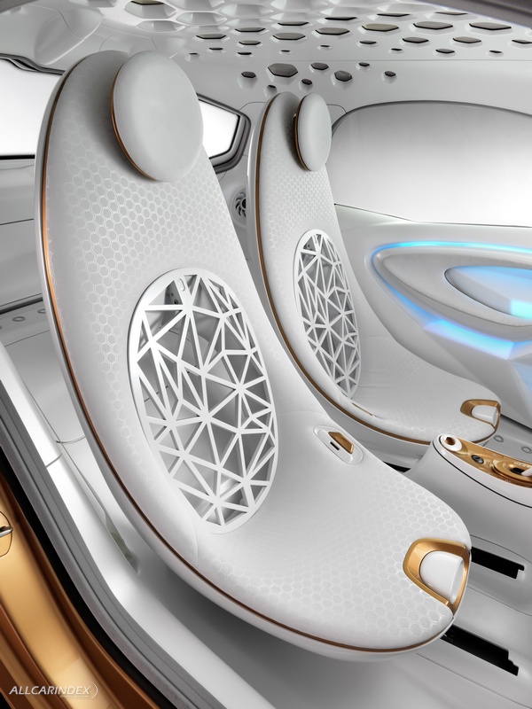 with a mix of polygonal surfaces and organic shapes the interior of the smart forvision builds a bridge to the architectural design handwriting of the exterior. this also applies to the colour concept: a cool white dominates in the interior as well, accentuated by the inner part of the instrument panel in liquid copper. hexagons in the form of white rubber nubs on a white floor are a reference to the design idiom of the overall vehicle, as is the tone-in-tone design of the seat upholstery.