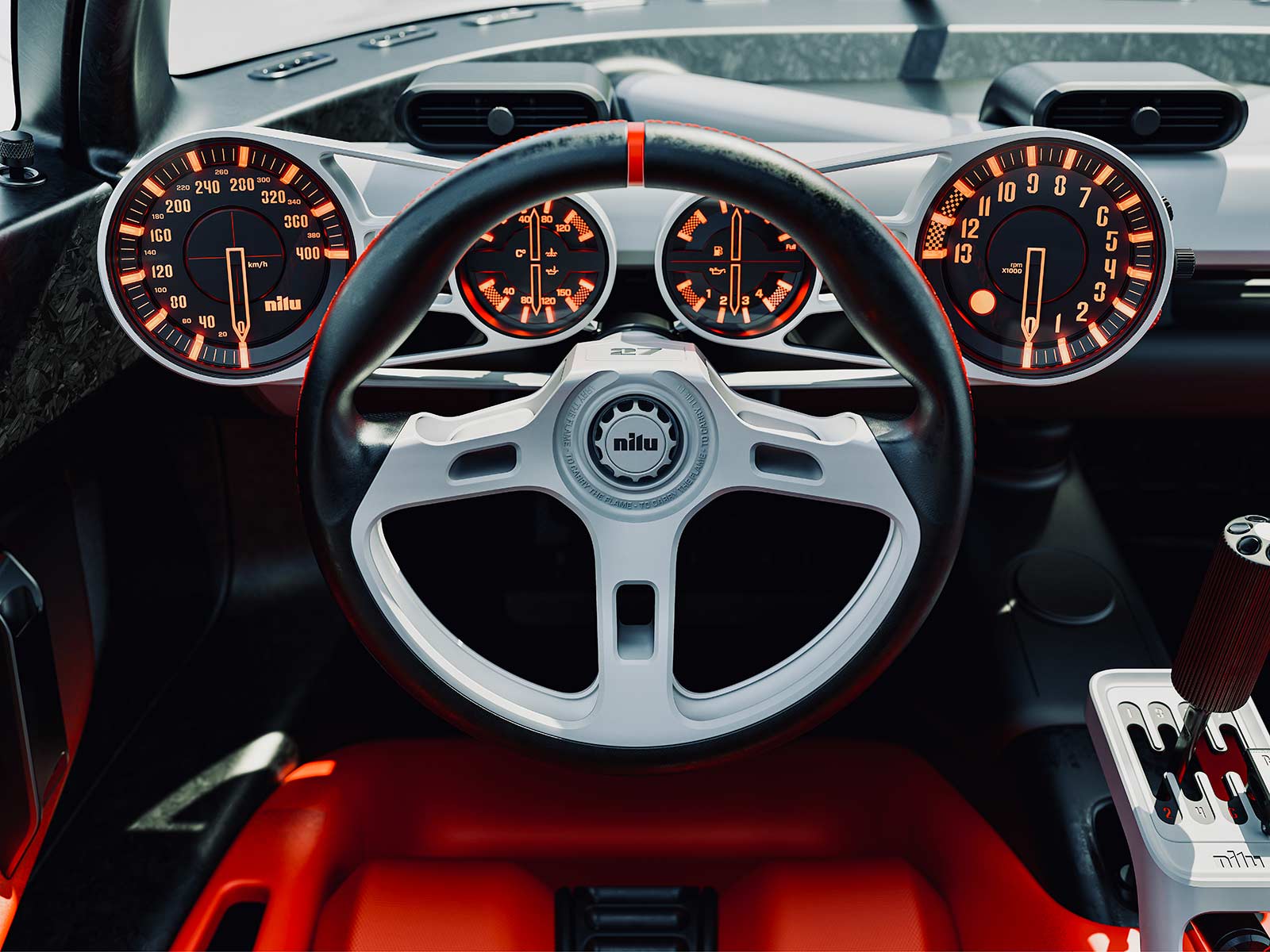 The NILU hypercar boasts a bespoke carbon fiber monocoque chassis and lightweight aluminum-alloy tubular subframes, diverging from modern composite subframes to enhance mechanical access and heat dissipation. The focus on a tactile, manual driving experience is evident in every aspect of the vehicle. The cabin is designed with ideal ergonomics and safety in mind, featuring a low roofline, compact dimensions, and manually adjustable controls, including a seven-speed open-gate manual transmission.