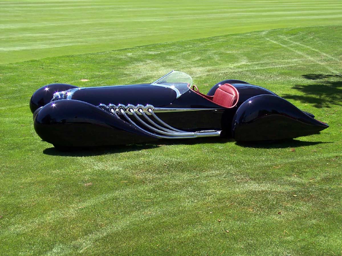With a hand-formed aluminum body and a chassis finished to show quality with nickel plating or powder coating, the B-702 is a stunning sight. The interior is wrapped in maroon leather, and the oversized speedometer cluster is reminiscent of classic Lincoln Zephyr models. It debuted at the Quail Lodge in Monterey, CA, in August 2007 and has since captivated audiences with its blend of American muscle and refined design.