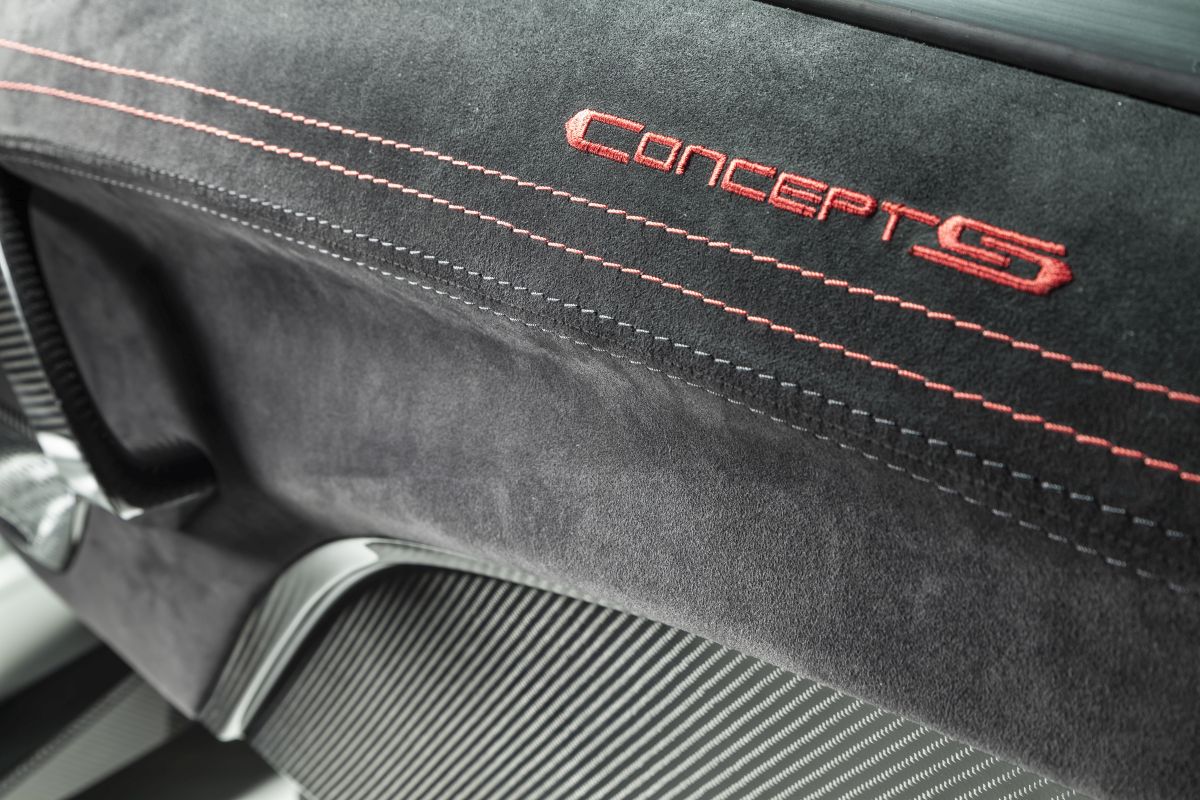 The Concept_S is all about maximum performance. To enhance grip at high speed the Concept_S features an extensive aero package. It all starts at the front where the splitter cuts through the air and generates downforce, pushing the front wheels to the ground. The air goes over the splitter, through the front intake, over the first four of the 7 cooling systems and out just before the front windshield. Part of the air is deflected by the side deflectors around the car, and as it hits the side skirts, more downforce is produced. The air is then grabbed by the side intakes and taken through the three remaining radiators and exits through the rear lights. Warm air meets with the air flowing under the car after it has been lifted upwards by the rear diffuser, filling up the low-pressure zone behind the car, thus minimizing drag. As the Concept_S cuts through the air, the spoiler produces downforce for the rear end, giving the rear wheels more grip needed to put the 1384 HP down to the ground. All this increases the downforce by 34 percent compared to the Concept_One, enabling grip levels of a high-performance racing car. More downforce not only enables more performance capabilities but also increases stability and safety at high speeds.