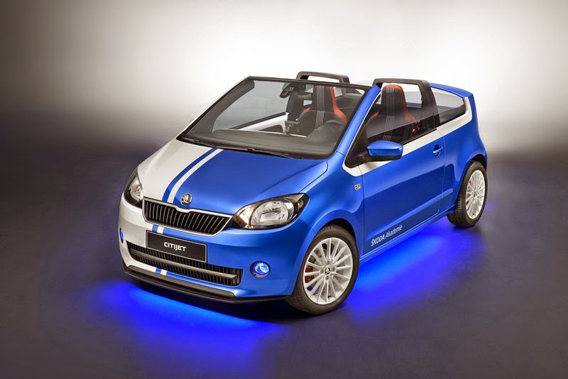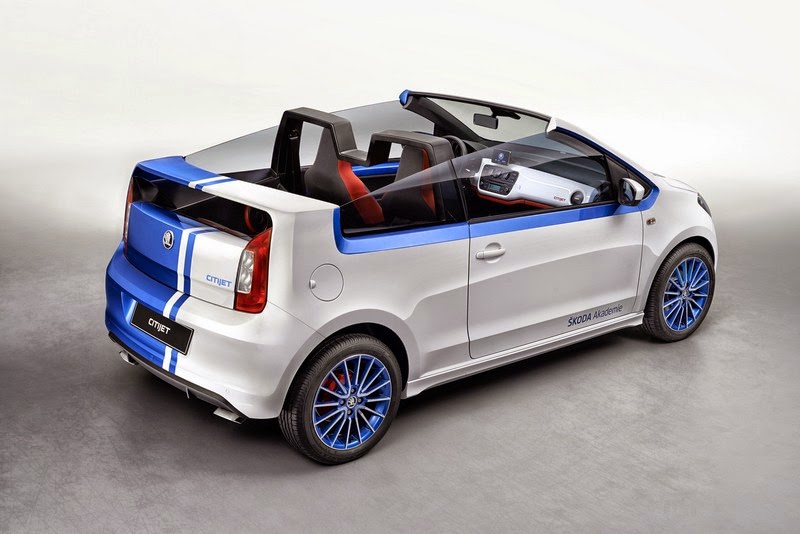 the škoda citijet is a dynamic and expressively designed city-convertible based on the škoda citigo. the exterior features distinctive metallic paintwork in blue/white and racy, blue 16-inch alloy wheels. it also features a hand-made rear spoiler as well as a powerful exhaust with two tailpipes. a 1.0 mpi petrol engine with 55 kw (75 ps) can be found under the bonnet of the vehicle.