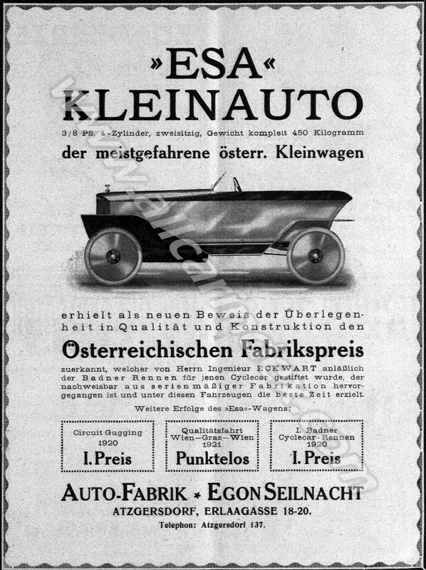 E.SA was an Austrian automobile manufacturer founded by Egon Seilnacht in Atzgersdorf, Vienna, during the early 1920s. The company operated from 1920 until 1926, during which it produced a limited number of vehicles characterized by their conventional chassis design.