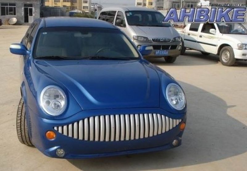 The green car was based on the Geely HQ Liangjing, but fitted with a completely new front, with new mudguards, bonnet and a giant gaping grille.