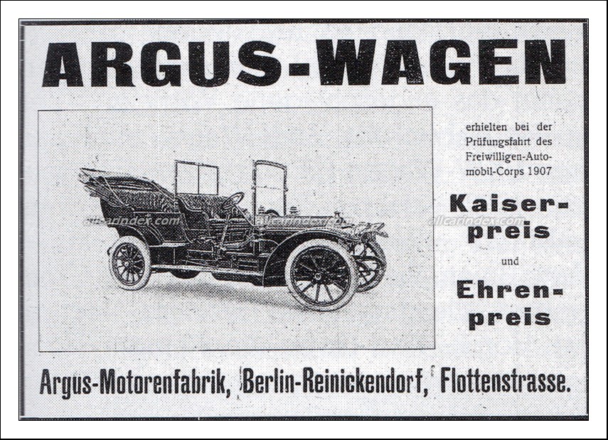 Argus was a German automobile manufacturer active from 1902 to 1906, founded by Paul Jeannin in Berlin-Reinickendorf. Initially, Jeannin imported Panhard vehicles from France, but he soon began producing his own cars. The first models, introduced in 1902, utilized Panhard engines and components. By 1903, Argus transitioned to manufacturing its own engines, offering a range of power outputs with 2-cylinder and 4-cylinder configurations, including a 2380cc 12PS engine, a 4960cc 20PS engine, and a 9260cc 40PS engine.