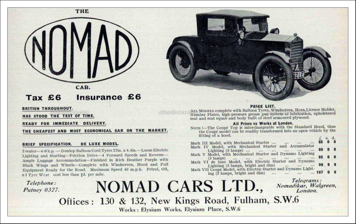 Gnome Cars Ltd and Nomad Cars Ltd were British automobile manufacturers that operated briefly in the mid-1920s. Founded in London, Gnome Cars Ltd was established in 1925, followed by the formation of Nomad Cars Ltd in 1926. Both companies focused on producing cyclecars, a category of lightweight vehicles that were popular during that era.