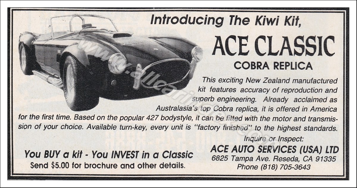 Ace Auto Services (USA) Ltd was an American automotive company based in Reseda, California, operational from 1991 to 1994. The company specialized in the assembly and sale of high-quality replicas of the classic Cobra sports car, originally designed by Carroll Shelby. These replicas were constructed by Graham Berry in New Zealand, ensuring a high standard of craftsmanship.