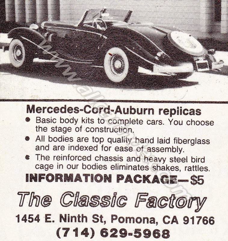 Classic Factory was an American automotive company based in Pomona, California, that operated around 1985. The company specialized in the production of replicas of classic cars, focusing on iconic models from the early to mid-20th century.