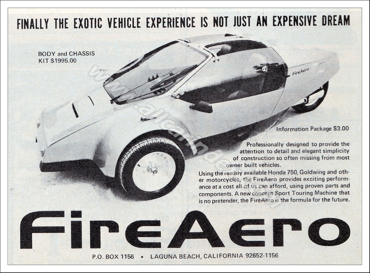 The Fire Aero was notable for its unique design as a three-wheeled coupe, which incorporated a 750cc motorcycle engine and running gear. The vehicle utilized a Volkswagen front suspension combined with Chevrolet steering, while the rear featured a complete motorcycle engine and suspension system. This innovative approach to vehicle design reflected a blend of automotive and motorcycle engineering principles.