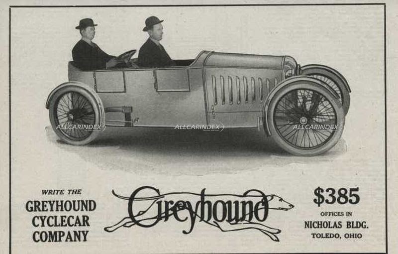 Greyhound was an American automobile brand that operated briefly between 1914 and 1916. The brand originated from the Toledo Cyclecar Company, based in Toledo, Ohio, where it was first introduced as a cyclecar. The Greyhound was marketed as "The Aristocrat of Cyclecars" and featured characteristics typical of light cars, including a four-cylinder water-cooled engine with a power output of 14 to 18 horsepower, a sliding gearbox, and shaft drive.