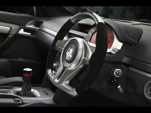 Unique sports-inspired flat-bottom steering wheel with integrated shift light display and suede grips;