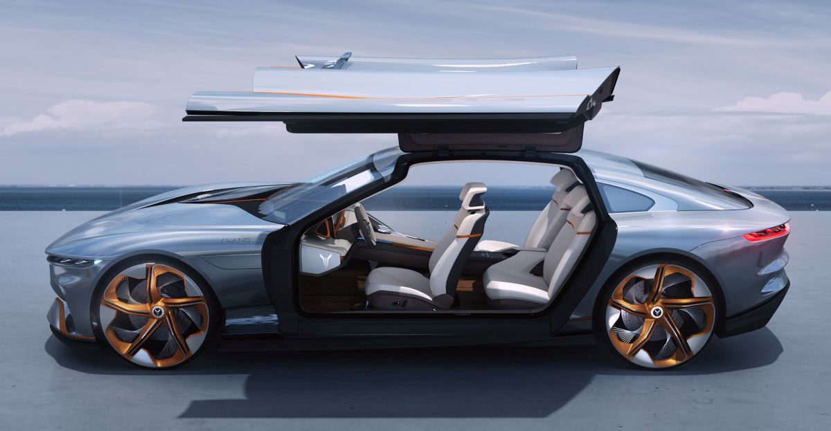i-LAND exteriors are inspired by the great Italian tradition of Gran Turismo cars, taking advantage of ESSA (Electric, Smart & Secure Architecture) electric platform, made available by the Chinese brand, to obtain a low and tapered profile.