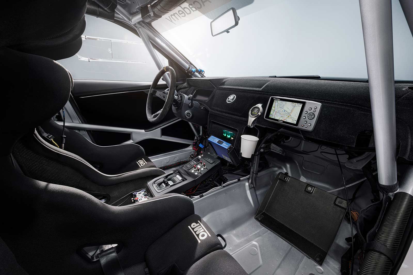 In-car features include an outdoor navigation system, including a kilometre counter, that allows the use of rally navigation. Two cameras with microphones are installed to record the drive, and these store the footage on memory cards. One camera is positioned on the ceiling between the seats, the other on the left-hand A-pillar above the dashboard.