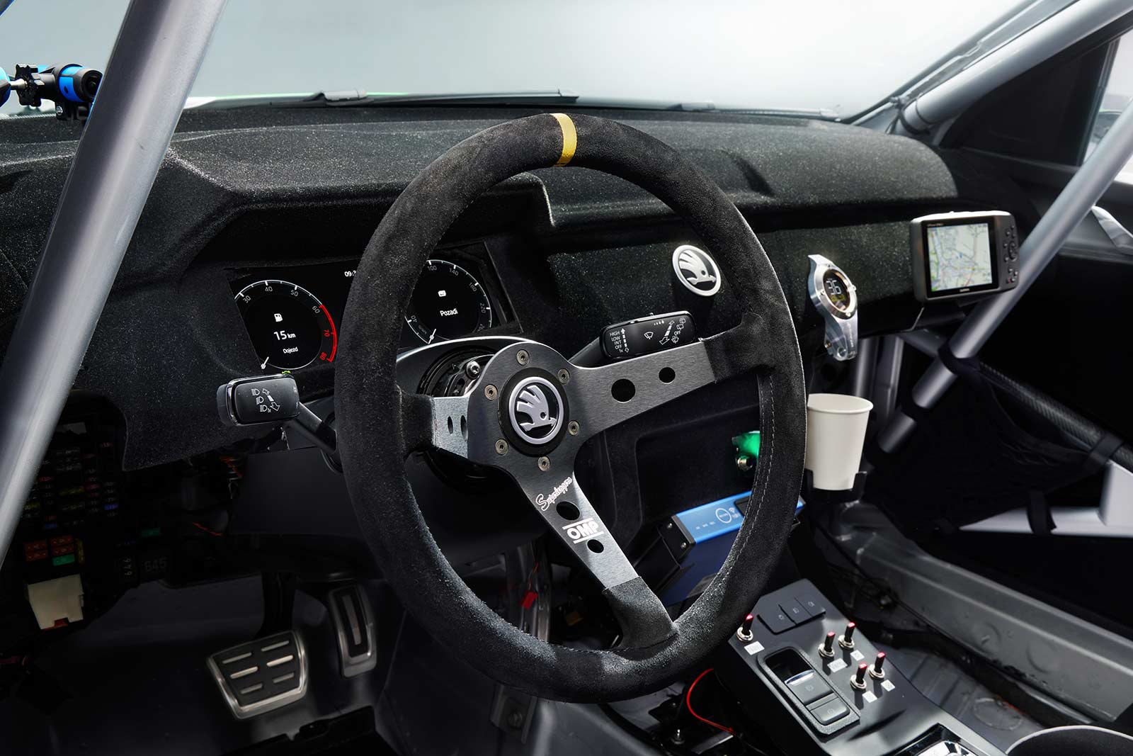 The students took a metaphorical axe to the interior, which is pared down like in all rally cars. There are special racing shell seats and six-point seatbelts, and the steering wheel and dashboard are from the ŠKODA FABIA Rally2 evo. The AFRIQ is also equipped with a fire extinguishing system for the crew’s safety.