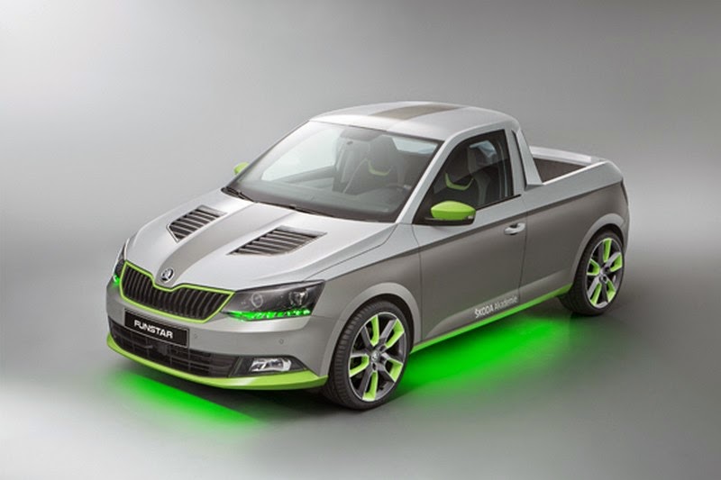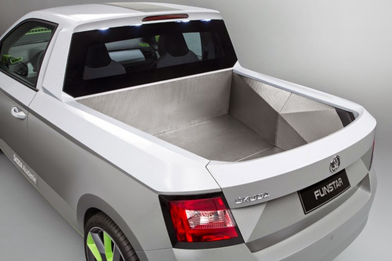 The ŠKODA FUNstar is a funky pickup based on the new ŠKODA Fabia – cheeky, fresh and surprising. This is a bright, sharp pickup with a real fun factor, not only in name. The ŠKODA FUNstar stands out with its metallic colours steel-grey and moon-white. The sills, grille surround and the rear spoiler form a striking contrast in reflex-green. One special feature is the LED lights mounted below the sidebars. The dual-lens headlights also feature LED technology, with green LED light strips serving as daytime running lights. LEDs are also used in the rear lights.