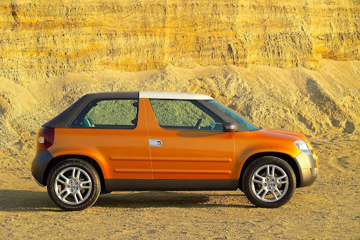The variable roof system of the Yeti was developed jointly with the renowned firm Karmann. The combination of hardtop and softtop (canvas roof) offers three variations of “open-air” travel. When driving with the roof down, the driver and passenger see the blue sky; when the rear section of the canvas roof is off, Yeti is transformed into a classic pick-up. If the crew decides to take a drive without both roof parts, they may look forward to maximum experience of a drive in an open vehicle.