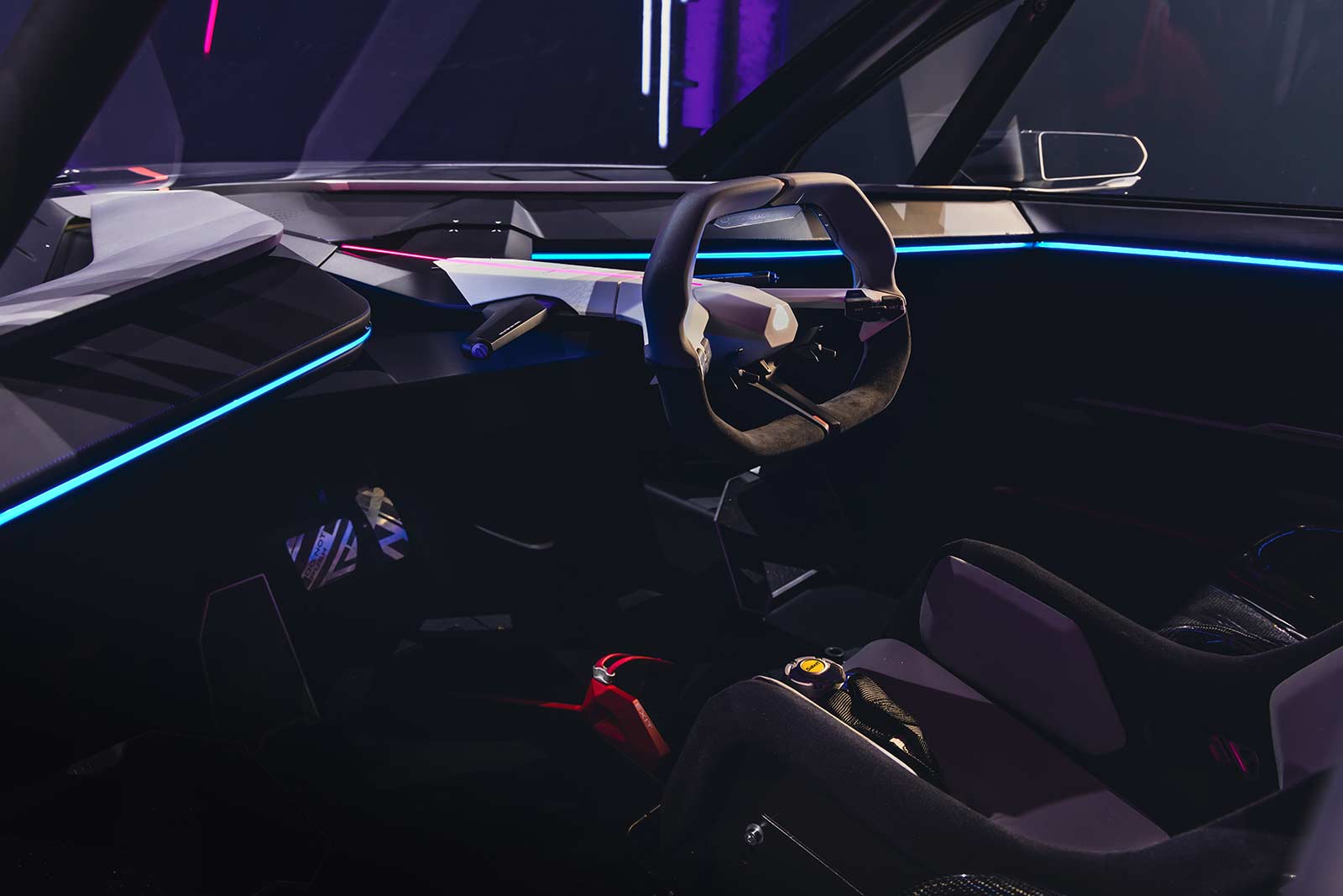 The cockpit is inspired by racing cars: it is minimalistic and all about performance and efficiency. The steering wheel packed with an assortment of motorsport-inspired features is a great example and the bucket seats and safety harnesses round out the effect.