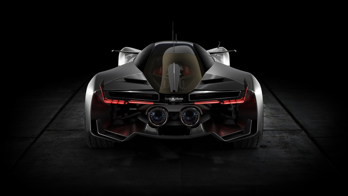 The AeroGT is a super car inspired by aviation. With this creation, Bell & Ross is keeping in touch with its aeronautic roots. Extremely low (1.10 m) and aerodynamic, the 4.7 meterlong car seems to split the air like an arrow. Its pointed forms with sharp angles and cutting overhangs are reminiscent of some stealth aeroplanes. All it needs to take off is a pair of wings. When seen from above, the drop-shaped glass roof recalls the glass cover of a jet cockpit. Meanwhile the razor-thin wing mirrors are inspired by the small wings called «canards» placed on the nose of a fighter. The two unusually sized exhaust pipes evoke turbojet engine exhausts, while the turbine-style rims imitate the vanes of supersonic aircraft engines. But the most impressive detail is the rear longitudinal aileron, which is reminiscent of an aircraft’s vertical stabilizer. The role of this element is to stabilize the racing car when performing quick turns. Ultimately, the Bell & Ross AeroGT concept car combines motoring and aviation to the greatest possible degree.